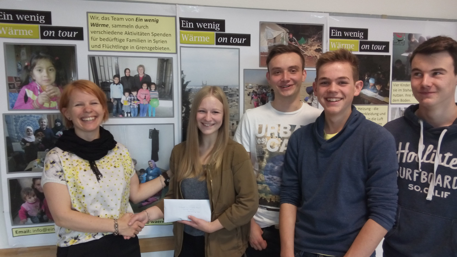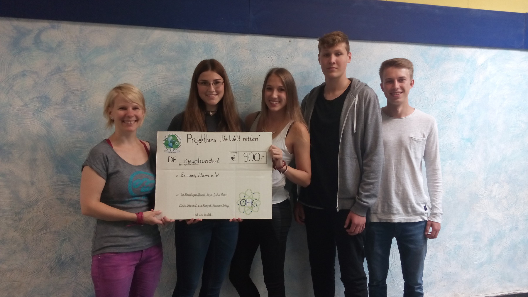 ausrangierten Schreibwaren neue, innovativ designte Ordner, die bei Eltern, Lehrern und Mitschülern reißenden Absatz fanden. Ihre Mühe kam uns zugute: Der Projektkurs spendete Ein wenig Wärme seinen kompletten Gewinn in Höhe von 484,33 Eur. Einen dicken fetten Dank an euch!!