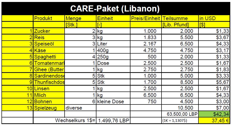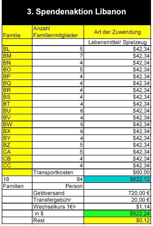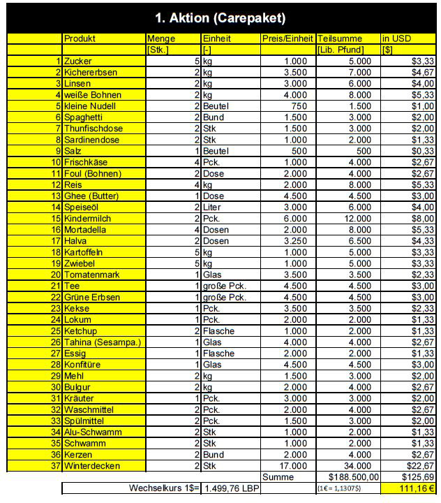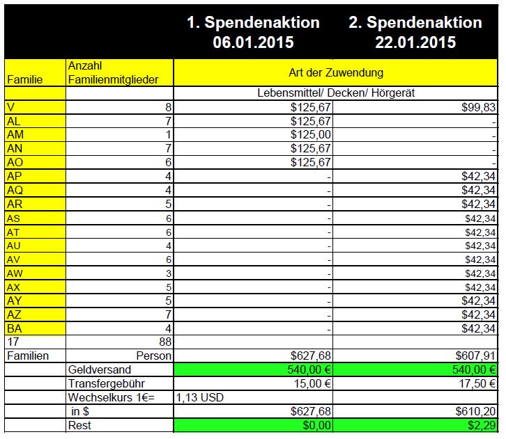 Die folgende Tabelle zeigen, was genau wir mit den Spendengeldern gekauft und verteilt haben.